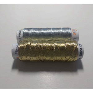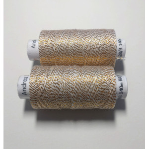 Kvalitní metalická příze, kde základem je bavlna jemnosti 35,5 x 3 tex obmotána metalickým proužkem. Barevnost bílá se zlatou.