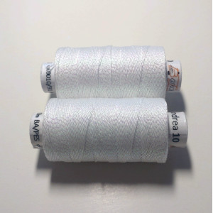 Kvalitní metalická příze, kde základem je bavlna jemnosti 35,5 x 3 tex obmotána metalickým proužkem. Barevnost bílá s perletí.
