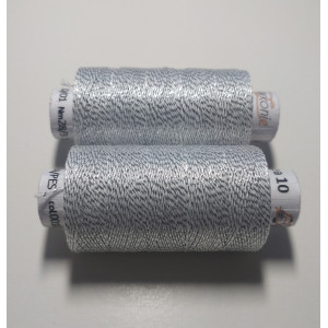 Kvalitní metalická příze, kde základem je bavlna jemnosti 35,5 x 3 tex obmotána metalickým proužkem. Barevnost - bílá se stříbrem.