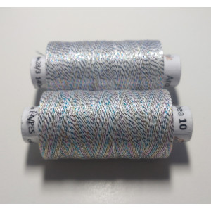 Kvalitní metalická příze, kde základem je bavlna jemnosti 35,5 x 3 tex obmotána metalickým proužkem. Barevnost bílá s duhovou.