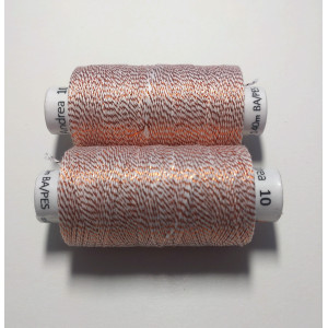 Kvalitní metalická příze, kde základem je bavlna jemnosti 35,5 x 3 tex obmotána metalickým proužkem. Barevnost bílá s mědí.