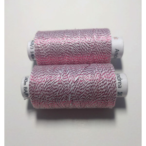 Kvalitní metalická příze, kde základem je bavlna jemnosti 35,5 x 3 tex obmotána metalickým proužkem. Barevnost bílá s tmavě růžovou.