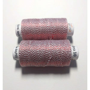 Kvalitní metalická příze, kde základem je bavlna jemnosti 35,5 x 3 tex obmotána metalickým proužkem. Barevnost bílá s vínově červenou.