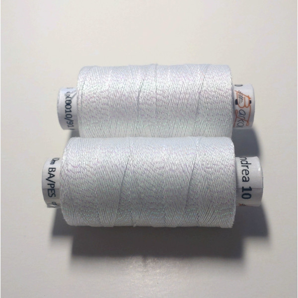 Kvalitní metalická příze, kde základem je bavlna jemnosti 35,5 x 3 tex obmotána metalickým proužkem. Barevnost bílá s perletí.