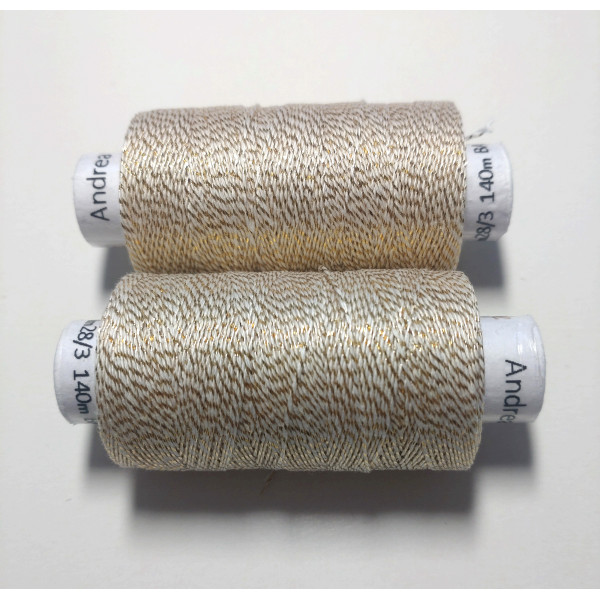 Kvalitní metalická příze, kde základem je bavlna jemnosti 35,5 x 3 tex obmotána metalickým proužkem. Barevnost bílá se zlatou.