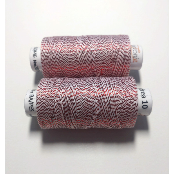 Kvalitní metalická příze, kde základem je bavlna jemnosti 35,5 x 3 tex obmotána metalickým proužkem. Barevnost bílá s vínově červenou.