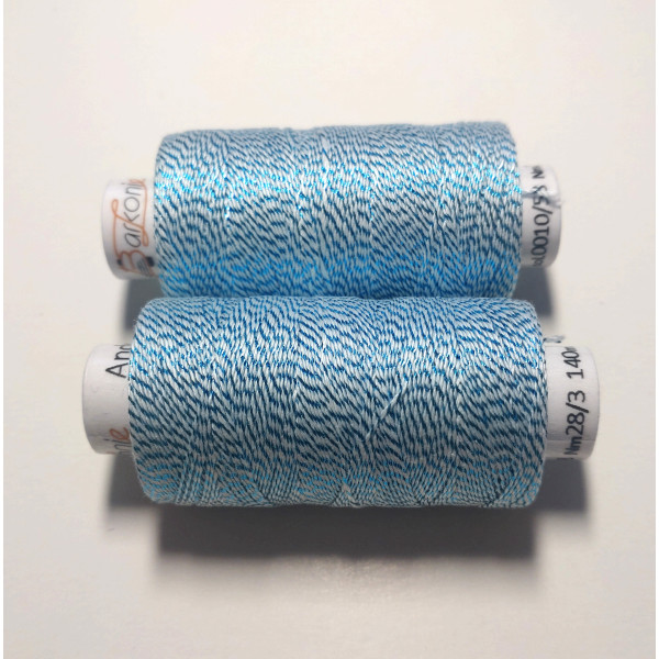 Kvalitní metalická příze, kde základem je bavlna jemnosti 35,5 x 3 tex obmotána metalickým proužkem. Barevnost bílá s tyrkysově modrou.