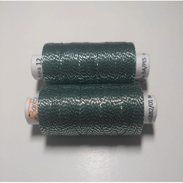 Kvalitní metalická příze, kde základem je bavlna jemnosti 35,5 x 3 tex obmotána metalickým proužkem. Barevnost temně zelená se stříbrem.