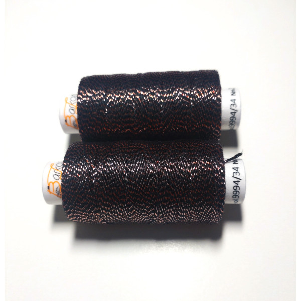 Kvalitní metalická příze, kde základem je bavlna jemnosti 35,5 x 3 tex obmotána metalickým proužkem. Barevnost černá s mědí.