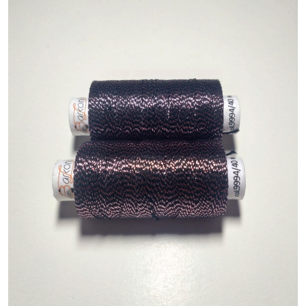 Kvalitní metalická příze, kde základem je bavlna jemnosti 35,5 x 3 tex obmotána metalickým proužkem. Barevnost černá s světle růžovým efektem.