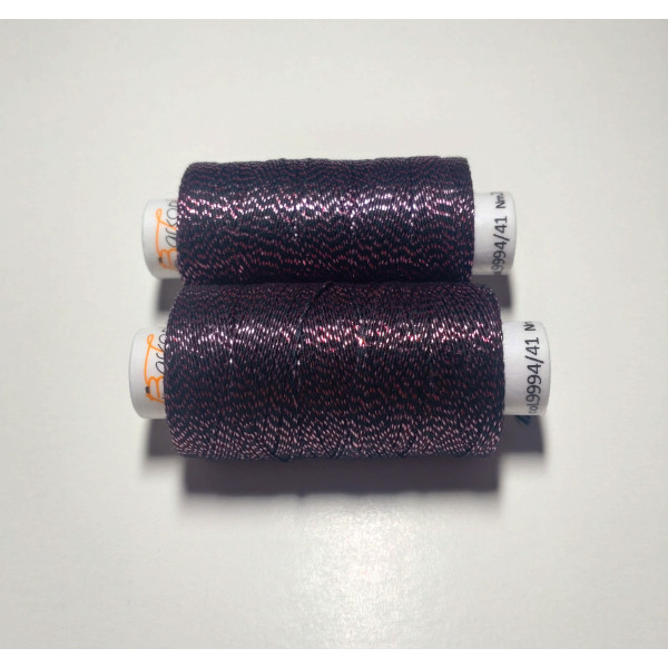 Kvalitní metalická příze, kde základem je bavlna jemnosti 35,5 x 3 tex obmotána metalickým proužkem. Barevnost černá s růžovým efektem.