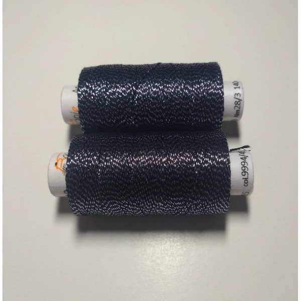 Kvalitní metalická příze, kde základem je bavlna jemnosti 35,5 x 3 tex obmotána metalickým proužkem. Barevnost černá s fialovým efektem.