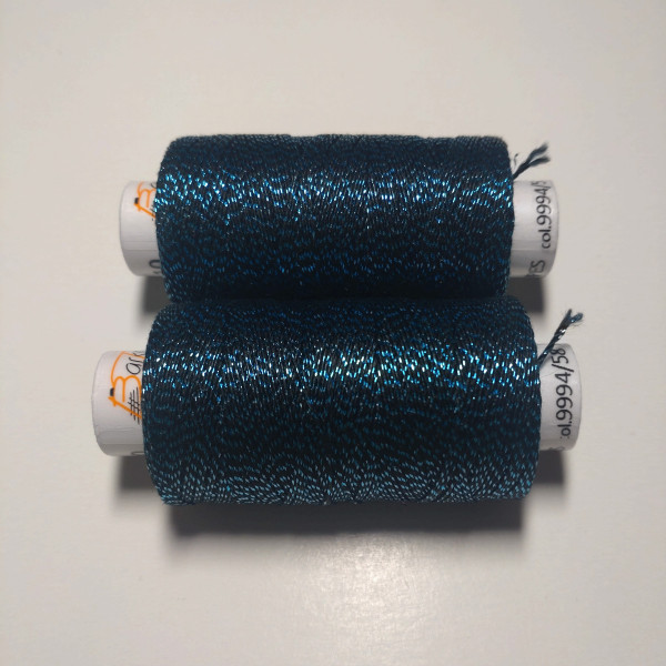 Kvalitní metalická příze, kde základem je bavlna jemnosti 35,5 x 3 tex obmotána metalickým proužkem. Barevnost černá s tmavým tyrkysovým efektem.