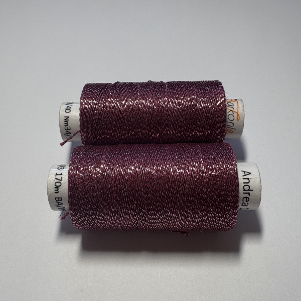 Kvalitní metalická příze, kde základem je bavlna jemnosti 35,5 x 3 tex obmotána metalickým proužkem. Barevnost vínová s efektní růžovou.